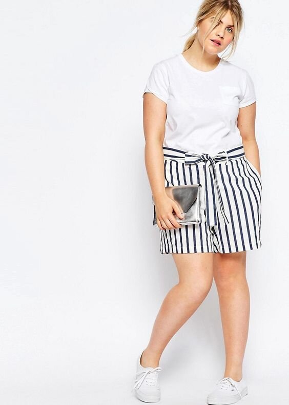 Шорты, которые стройнят — это белая модель в черную вертикальную полоску. Завышенная талия поможет визуально удлинить ноги, а также сделает бедра на несколько сантиметров меньше. В этом образе черно-белые шорты стилисты дополнили белой хлопковой футболкой оверсайз размера, а также светлыми кедами.