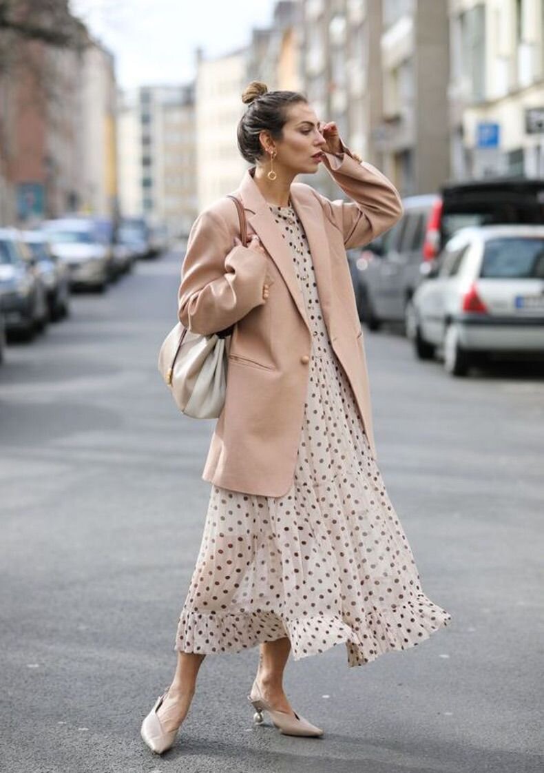 Стилисты создали изящный, женственный и пленительный образ, включив в него лёгкое платье миди в некрупный горошек, свободный жакет нюдового цвета, светлые туфли со слингбэками и заострёнными носами, а также вместительную сумку в спокойных бежевых оттенках. Стоит отметить и серьги, которые прекрасно дополнили этот ансамбль.