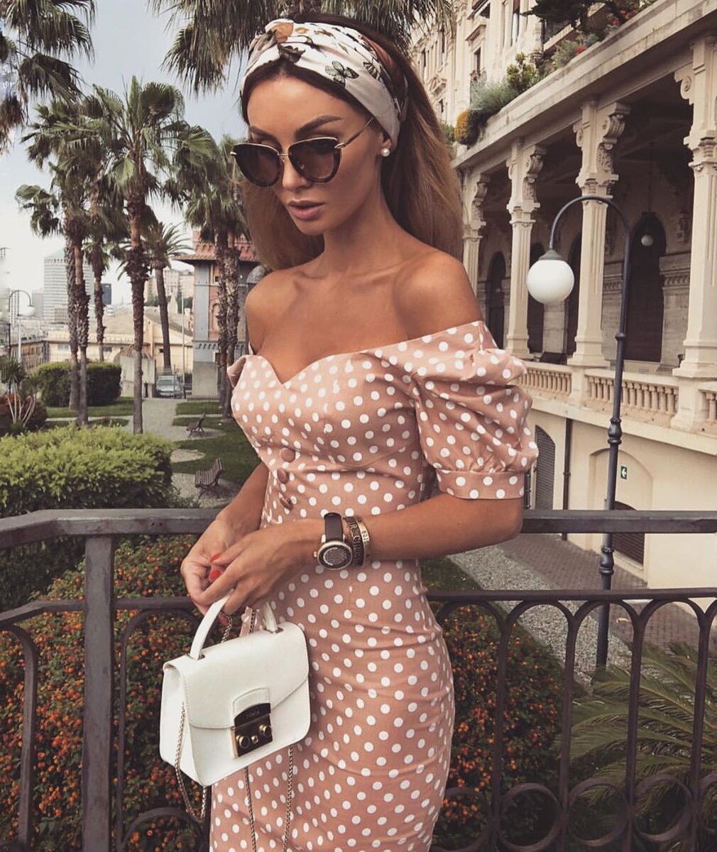 Романтическое платье с открытыми плечами бежевого цвета в мелкий белый горошек + белая каркасная сумка с короткой ручкой + принтованный шелковый платок + эффектные крупные очки — гармоничный look для особого случая.
