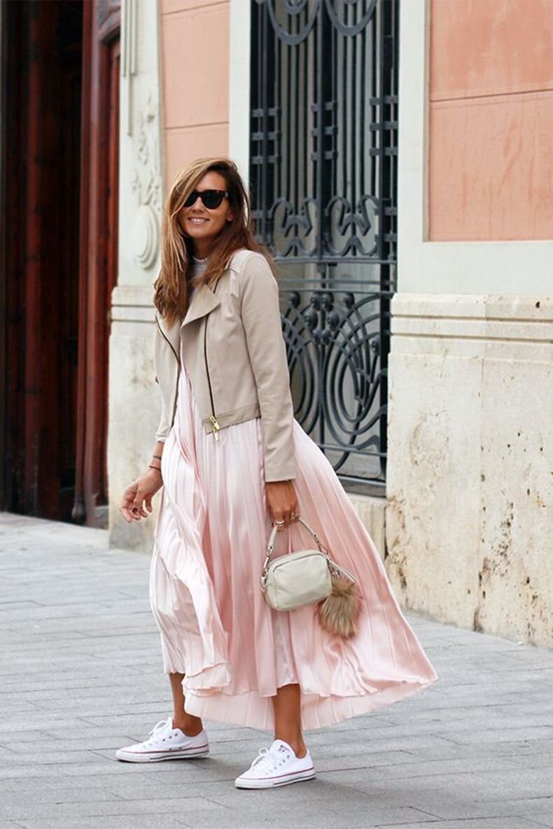 Нежные и романтичные платья нюдового цвета стилисты предлагают дополнить дерзкими куртками, светлыми кедами и минималистичными моделями клатчей.